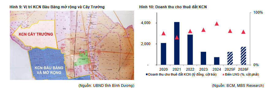 Năm 2025-26, chuyển nhượng BĐS đóng góp chính vào doanh thu của công ty. Dự phóng diện tích đất thương phẩm bán tại Thủ Dầu Một, Bến Cát và Thuận An thêm 3/ 4 ha, 0/ 1 ha và 1/ 1 ha, qua đó doanh thu đạt 3,519 tỷ đồng (-5% svck)/ 3,984 tỷ đồng (+13% svck) năm 2025-26