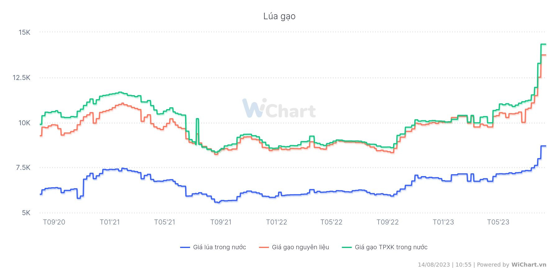 Do đó, khoảng gap giữa giá lúa và giá gạo xuất khẩu (đường màu xanh lá cây và đường màu xanh da trời) có thể xem là biên lãi của ngành xuất khẩu gạo trong nước.