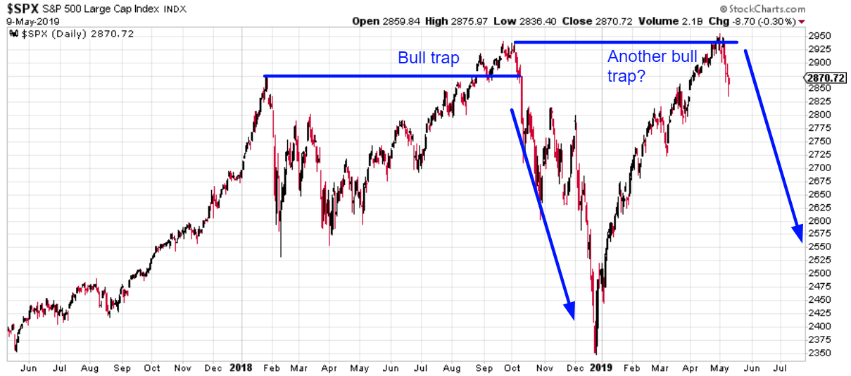 Ví dụ: Trong một thị trường chứng khoán đang giảm điểm, giá của một chỉ số chẳng hạn như S&P 500 giảm mạnh trong một phiên giao dịch. Nhiều nhà đầu tư bán ra cổ phiếu của họ vì họ nghĩ rằng thị trường đang vào giai đoạn giảm (bear market). Tuy nhiên, sau đó, thị trường tăng trở lại, và giá chỉ số S&P 500 tăng. Những người đã bán ra có thể phải mua lại cổ phiếu với giá cao hơn, và họ đã bị nắm giữ trong một bear trap.