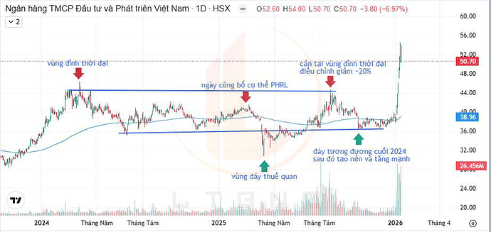 Sau sự kiện này, BID đã tạo đáy tại vùng giá xấp xỉ 31.000đ/cổ phiếu. Đây là vùng chiết khấu khá rẻ cho cả thị trường nói chung, BID nói riêng nên sau đó cổ phiếu này đã bật tăng mạnh trở lại. Cùng với nhiều chính sách kích thích nền kinh tế trong nước, BID đã tăng vượt cả mức đỉnh đã thiết lập ở giai đoạn kể trên và chạm mốc gần 44.000đ/cổ phiếu. Đây lại là một cản lớn của cổ phiếu này – cũng là mức đỉnh thời đại trong bối cảnh thị trường chung không thuận lợi, nên đã chiết khấu khoảng 20%. Mức đáy mới này rơi vào vùng giá khoảng 36.000đ/cổ phiếu – tương đương vùng đáy cuối năm 2024 trước khi tạo nền mới và tăng mạnh ngay trong những ngày đầu năm 2026.