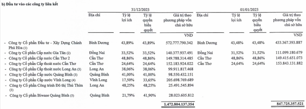 Báo cáo tài chính hợp nhất quý IV/2023 của Biwase ghi nhận, tại ngày 31/12/2023, doanh nghiệp này nắm 33,65% tỷ lệ quyền biểu quyết và 17,5% tỷ lệ lợi ích tại Vwaco. Tại Biwase Quảng Bình, tỷ lệ quyền biểu quyết của Biwase là 41,9% và tỷ lệ lợi ích là 21,79%.