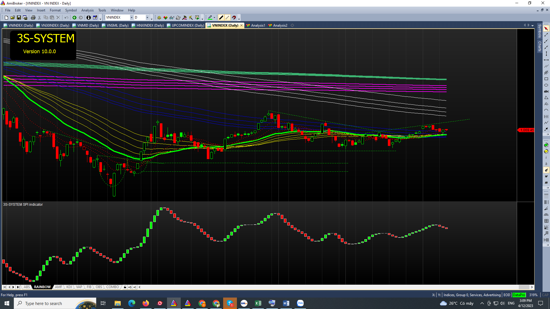 Tổng kết phiên, Vnindex giảm nhẹ 0.01đ còn 1069.45đ, độ rộng thị trường ở mức trung bình khi có 190 mã tăng/ 188 mã giảm.