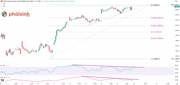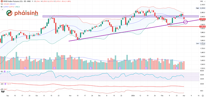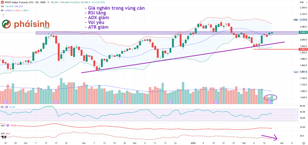 Trong khi VNI sắp tiếp cận cản động tại quanh 1900 (dải trên BB), thì VN30F cũng đang bị mắc kẹt ở vùng cản 2035 – 2055. Cần lưu ý, vùng 1900 đang là vùng giá đỉnh lịch sử của VNI.