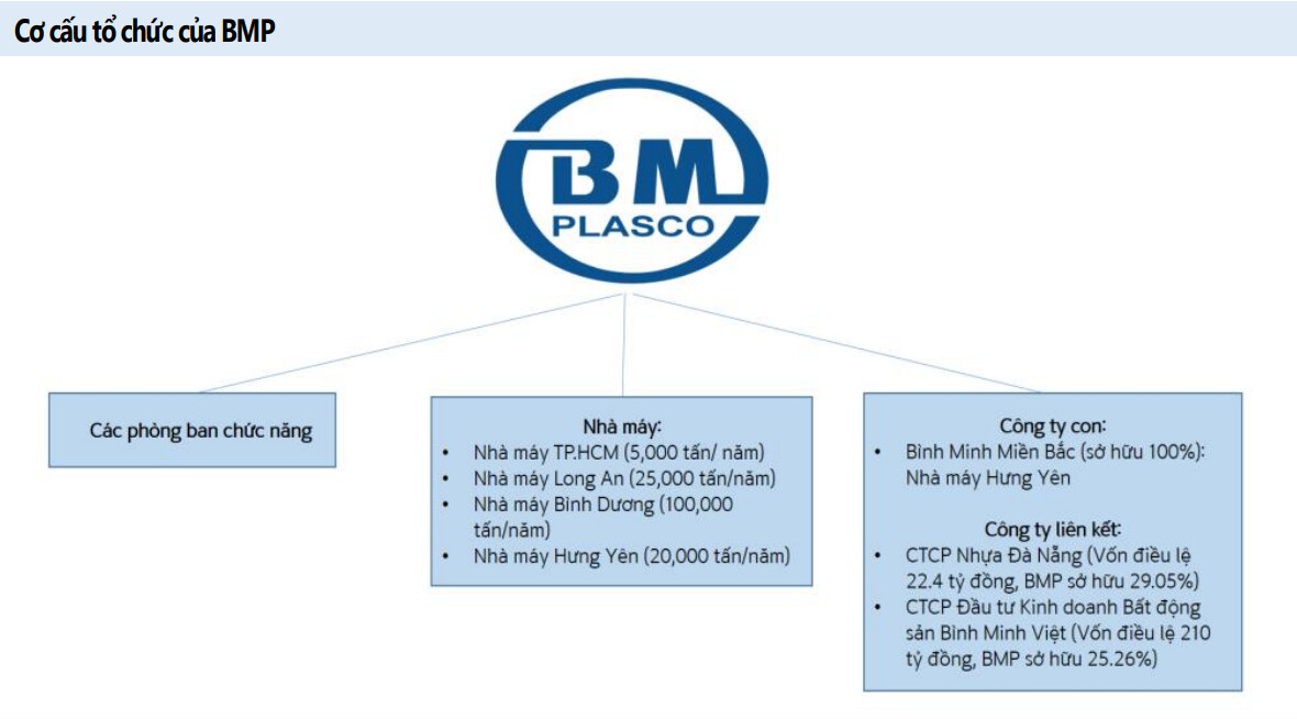 BMP hiện sở hữu 100% tại 4 nhà máy sản xuất ống nhựa, bao gồm 3 nhà máy ở miền Nam (Bình Dương: 100,000 tấn/năm; Long An: 25,000 tấn/năm; TP. HCM: 5,000 tấn/năm) và 1 nhà máy ở miền Bắc (Hưng Yên: 20,000 tấn/năm)