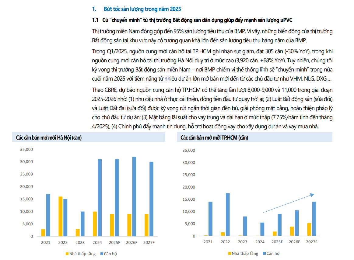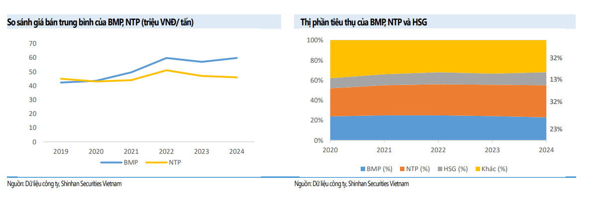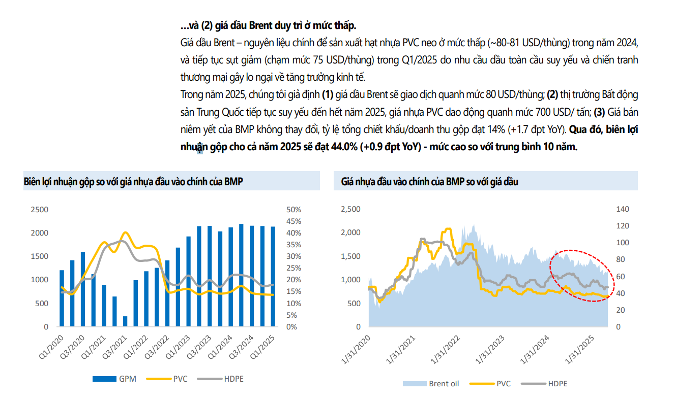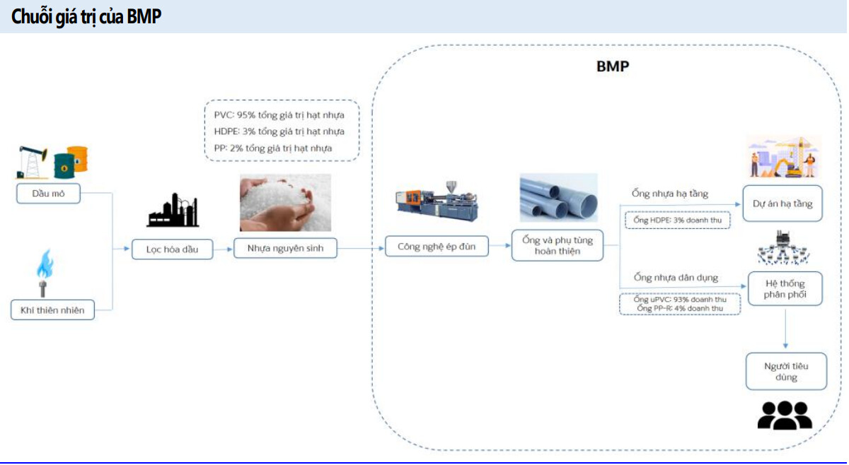 BMP sử dụng nguyên vật liệu là hạt nhựa nguyên sinh (PVC, HDPE, PPR) chiếm 70% -80% chi phí sản xuất. Trong đó, PVC là loại hạt nhựa chiếm tỷ trọng lớn nhất với 95% tổng giá trị hạt nhựa, tương ứng 81% giá trị nguyên vật liệu. Đặc biệt, khác với phần lớn các doanh nghiệp trong ngành (chủ yếu dùng hạt nhựa nhập khẩu),