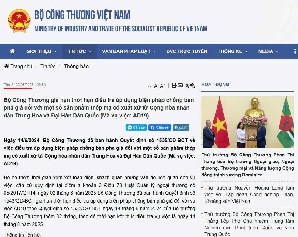 Bộ Công Thương gia hạn thời hạn điều tra áp dụng biện pháp chống bán phá giá đối với một số sản phẩm thép mạ có xuất xứ từ Cộng hòa nhân dân Trung Hoa và Đại Hàn Dân Quốc