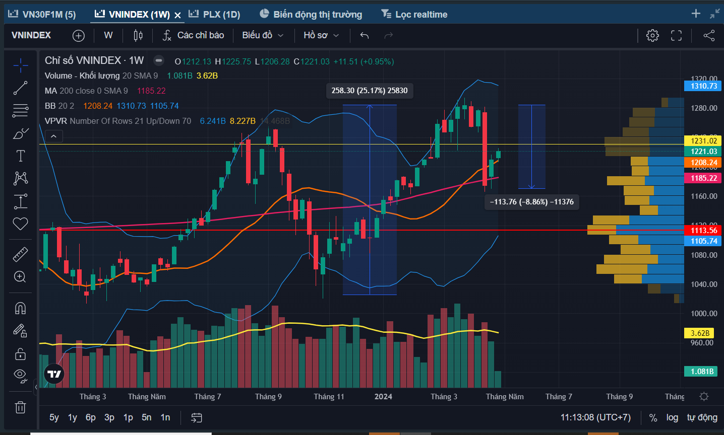 TTCK sau khi tăng 5 tháng với khoảng 25% từ đáy cuối tháng 10/2023 đã có nhịp chỉnh khoảng 8.2% trong 5 tuần qua, vnindex giảm 8.8% nhưng nhiều CP Beta cao giảm 17-25%.