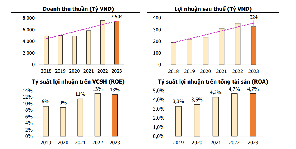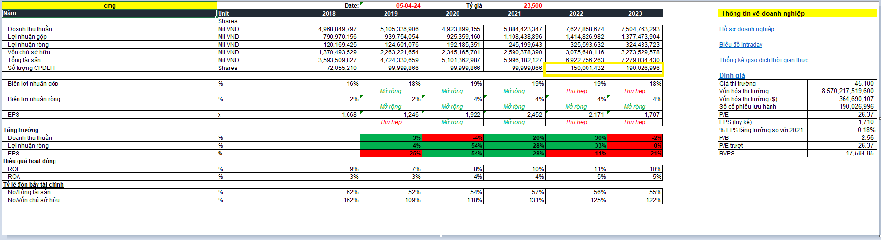 Năm 2023 và 2022 Doanh nghiệp có sự tăng trưởng mạnh mẽ của DT và LNST so với 2021 , tuy nhiên 2 năm chia cổ tức bằng CP để tăng vốn do đó EPS suy giảm so với 2021.