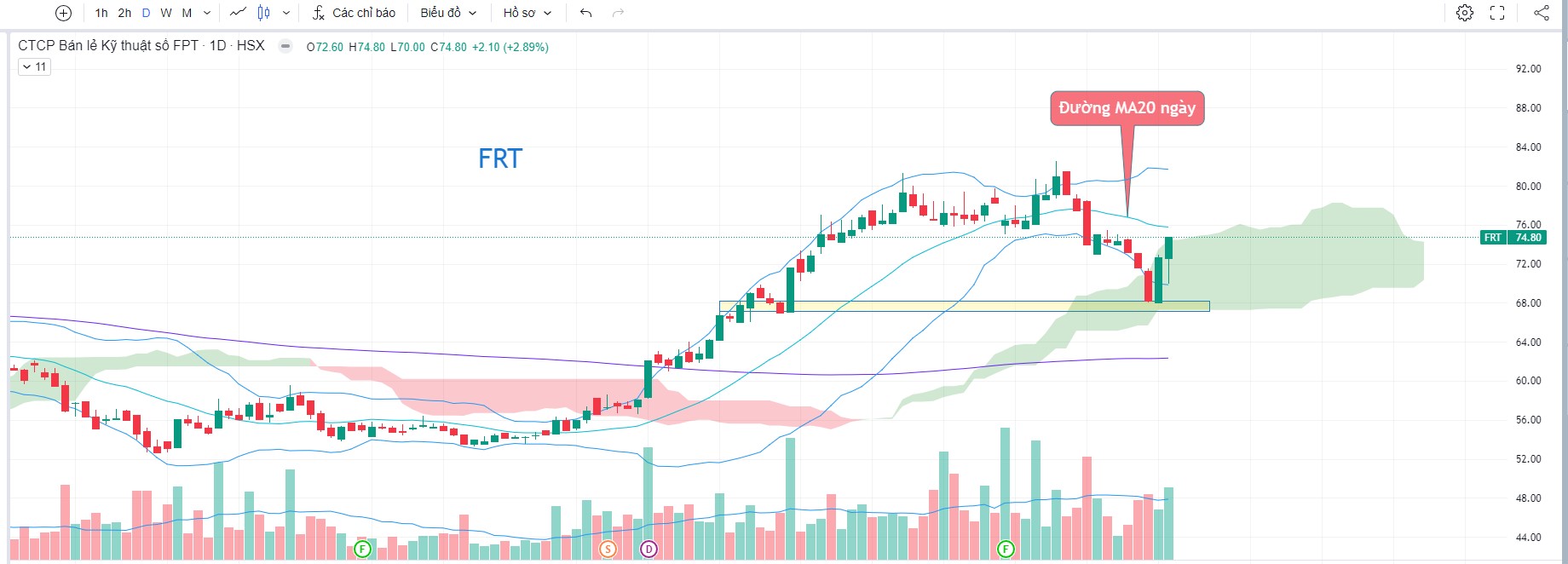 FRT hôm nay có phiên hồi phục rất mạnh, tốt hơn mặt bằng chung của thị trường sau nhiều phiên giảm liên tiếp và gãy các mốc hỗ trợ. Điểm trừ của FRT hôm nay mặc dù giá hồi phục tốt nhưng khối lượng lại rất thấp nên cho chúng ta cách nhìn đây có thể là phiên hồi phục kỹ thuật sau nhịp giảm liên tiếp. Vì vậy em có thể quan sát thêm cổ phiếu trong 1, 2 phiên để tìm đc điểm cân bằng của cổ phiếu trước khi mua mới.