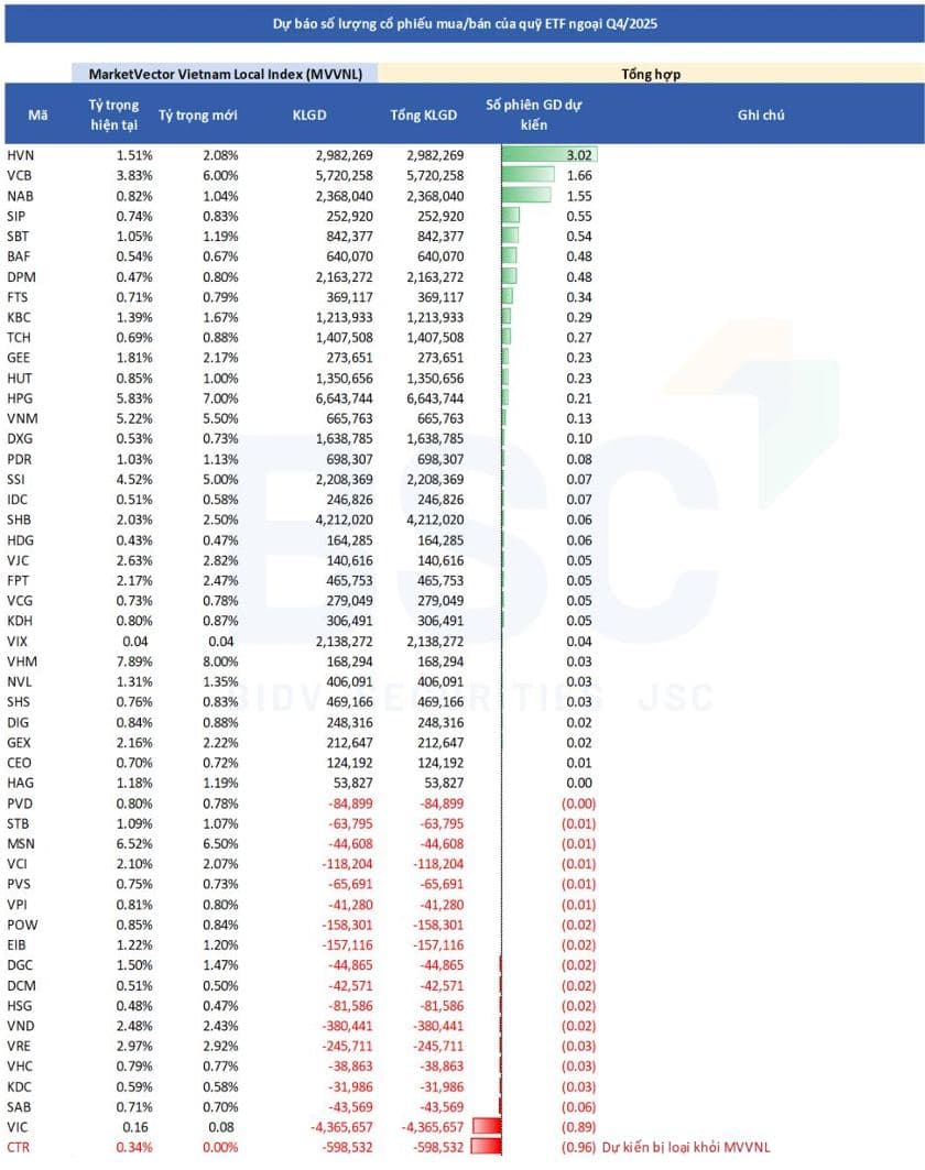 Chứng khoán BSC vừa công bố dự báo cho kỳ cơ cấu quý IV/2025 của quỹ ngoại VanEck Vectors Vietnam ETF, dựa trên chỉ số tham chiếu MarketVector Vietnam Local Index.