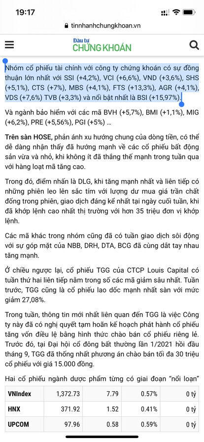 Nhóm cổ phiếu tài chính với công ty chứng khoán có sự đồng thuận lớn nhất với SSI (+4,2%), VCI (+6,6%), VND (+3,6%), SHS (+5,1%), CTS (+7%), MBS (+4,1%), FTS (+13,3%), AGR (+4,1%), VDS (+7,6%) TVB (+3,3%) và nổi bật nhất là BSI (+15,97%).
