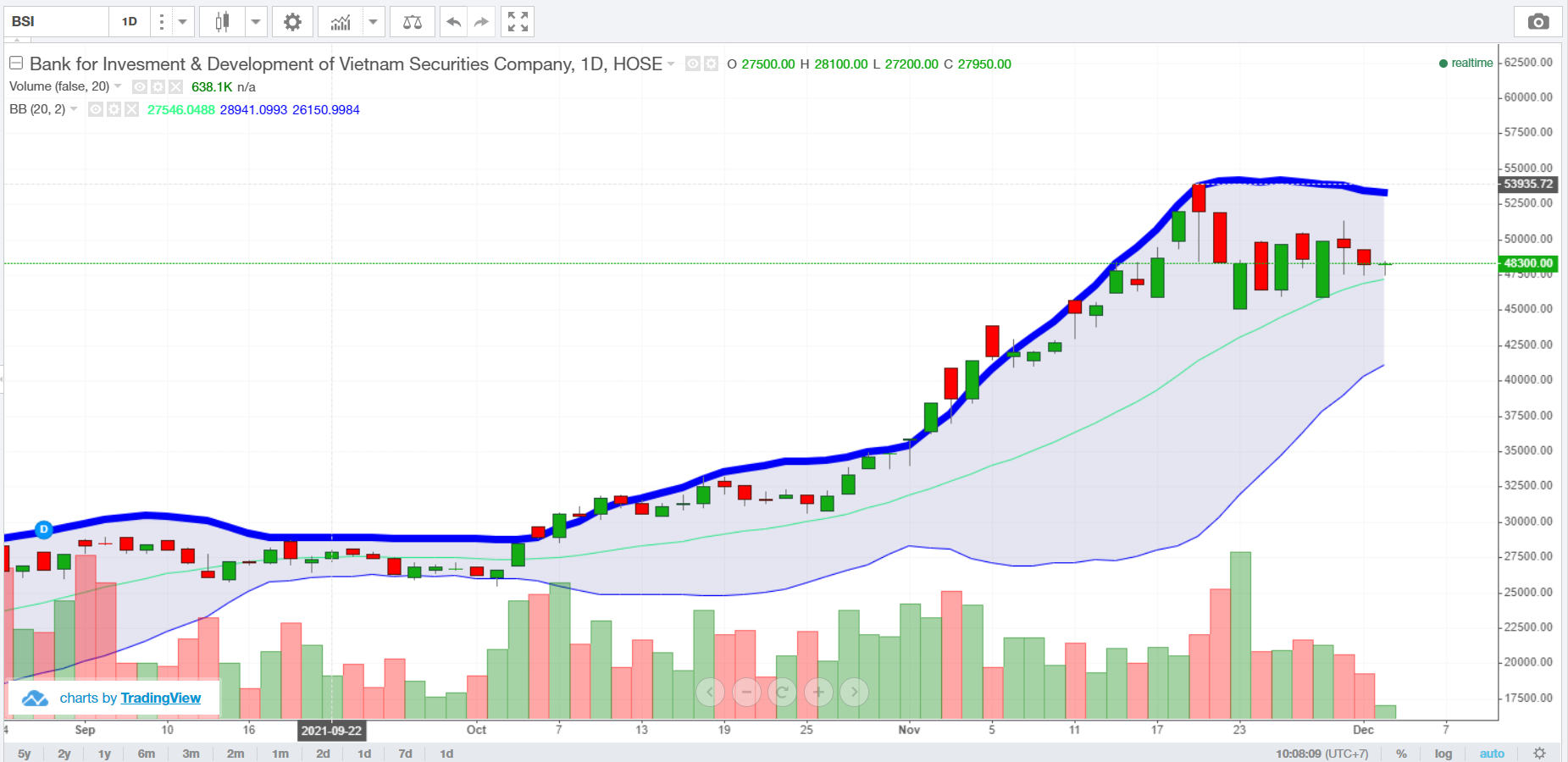 Trên thị trường, cổ phiếu BSI chốt phiên 26/11 đạt 48.700 đồng/cổ phiếu, chỉnh 6,5% kể từ mức đỉnh lịch sử 52.100 đồng/cổ phiếu (phiên 18/11).