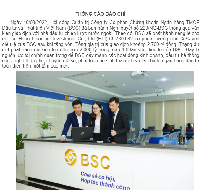 Với việc chốt giao dịch thanh toán theo thỏa thuận đặt mua cổ phần với Hana Securites vào ngày 26/9/2022 (tổng giá trị đặt mua gần 2.700 tỷ đồng cho hơn 65,73 triệu cổ phần, tương đương mức giá 41.000 đồng/cổ phần), BSC sẽ có thể đẩy mạnh các hoạt động kinh doanh, đầu tư hệ thống công nghệ thông tin, chuyển đổi số và phát triển hệ sinh thái dịch vụ tài chính toàn diện.