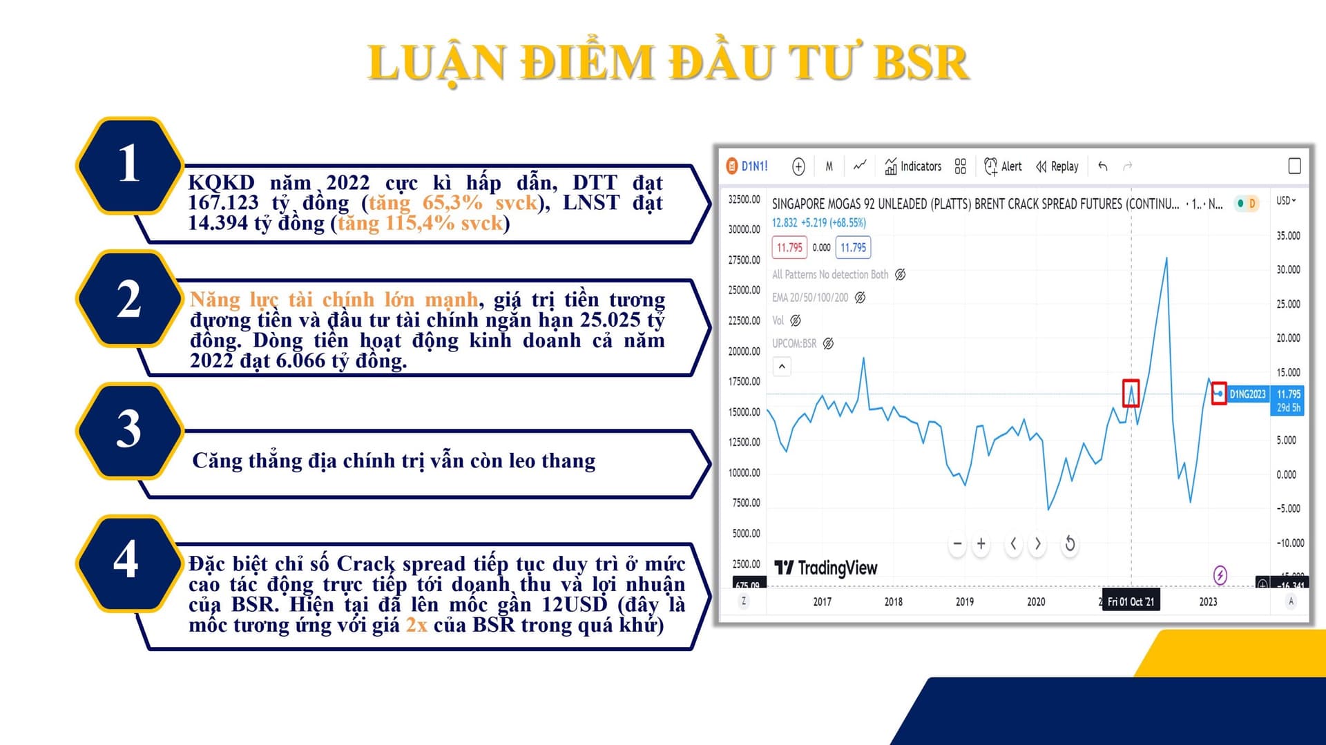 DN tiền mặt nhiều. Đặc biệt chỉ số Crack spread tiếp tục duy trì ở mức cao do căng thẳng chính trị - đây là yếu tố tác động trực tiếp đến doanh thu, lợi nhuận BSR.