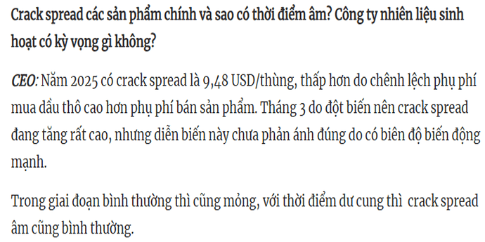 - Biến động Crack Spread: Chênh lệch giữa giá sản phẩm bán ra và dầu thô đầu vào rất thất thường. Kết quả quý 1 cực tốt nhưng khó duy trì đều đặn do giá dầu thế giới biến động mạnh