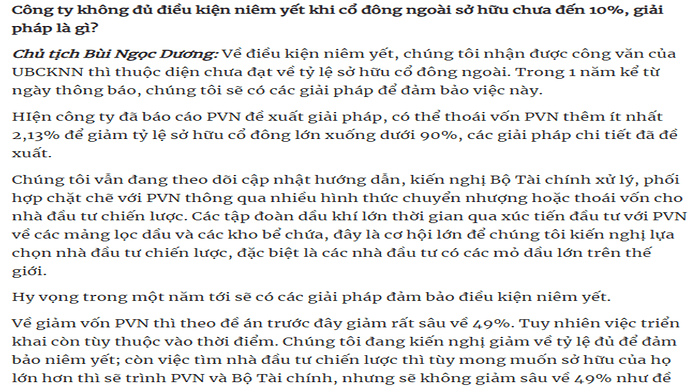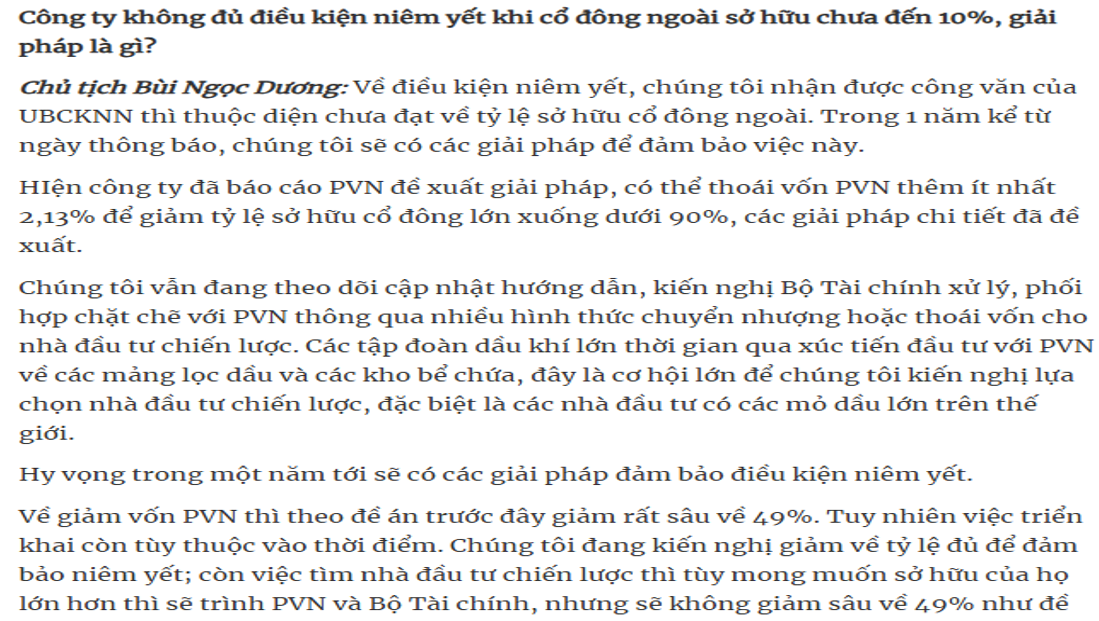 - Chuyển sàn: Để niêm yết trên HOSE, PVN cần thoái thêm ít nhất 2,13% vốn tại BSR để đạt tỷ lệ sở hữu ngoài 10%. Hiện giải pháp mới dừng lại ở mức đề xuất và cần ít nhất 1 năm nữa để thực hiện