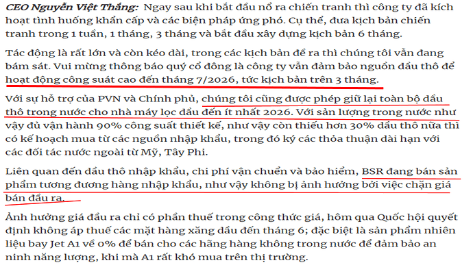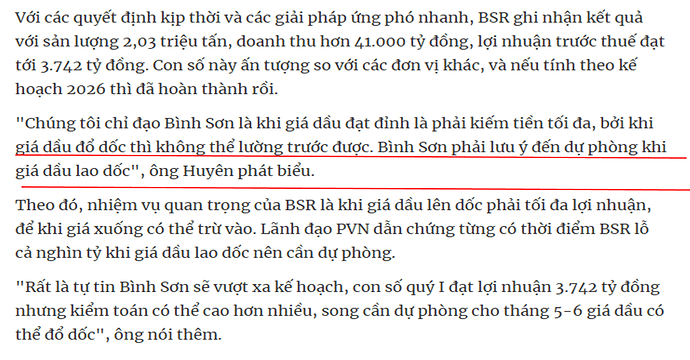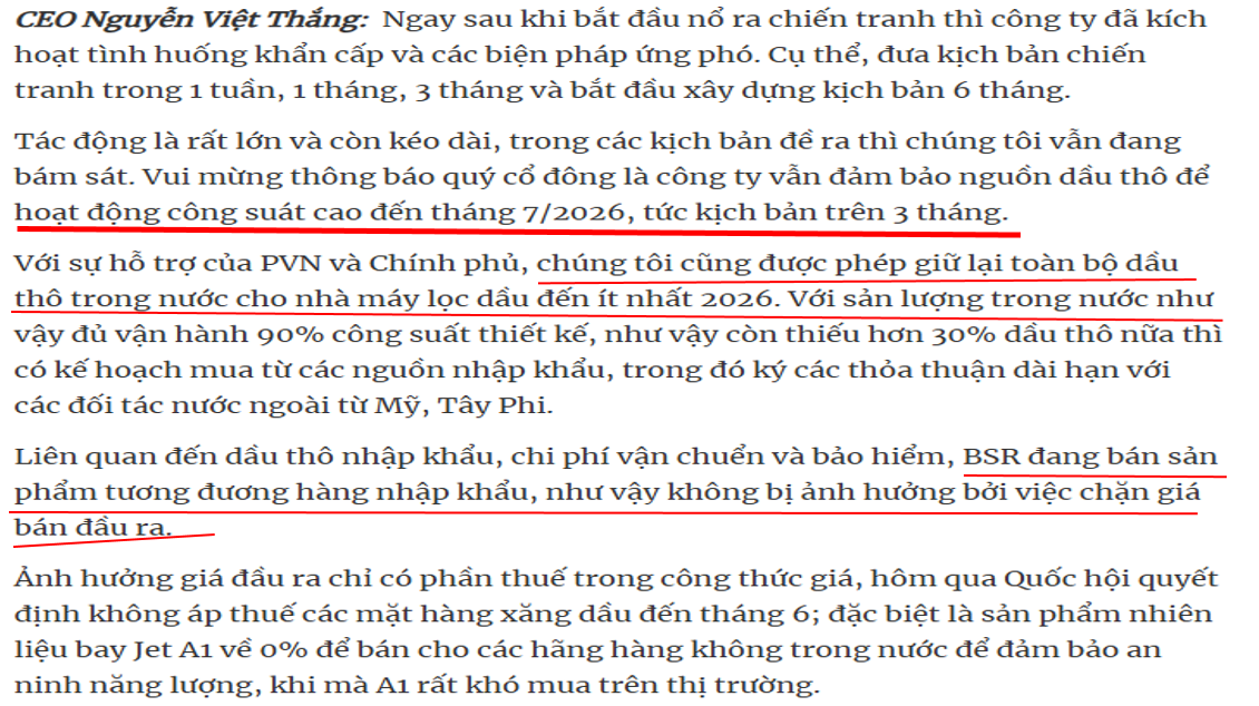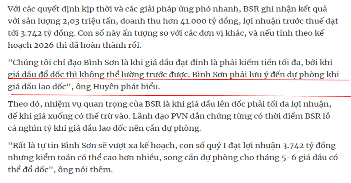 - Rủi ro giá dầu lao dốc: BSR đã ký kết nhập tồn kho ở mức giá cao (đỉnh điểm căng thẳng Iran). Nếu căng thẳng hạ nhiệt và giá dầu thế giới giảm mạnh trong quý 2 và quý 3, BSR có thể đối mặt với kịch bản kinh doanh kém khả quan, thậm chí thua lỗ do phải bán ra giá thấp