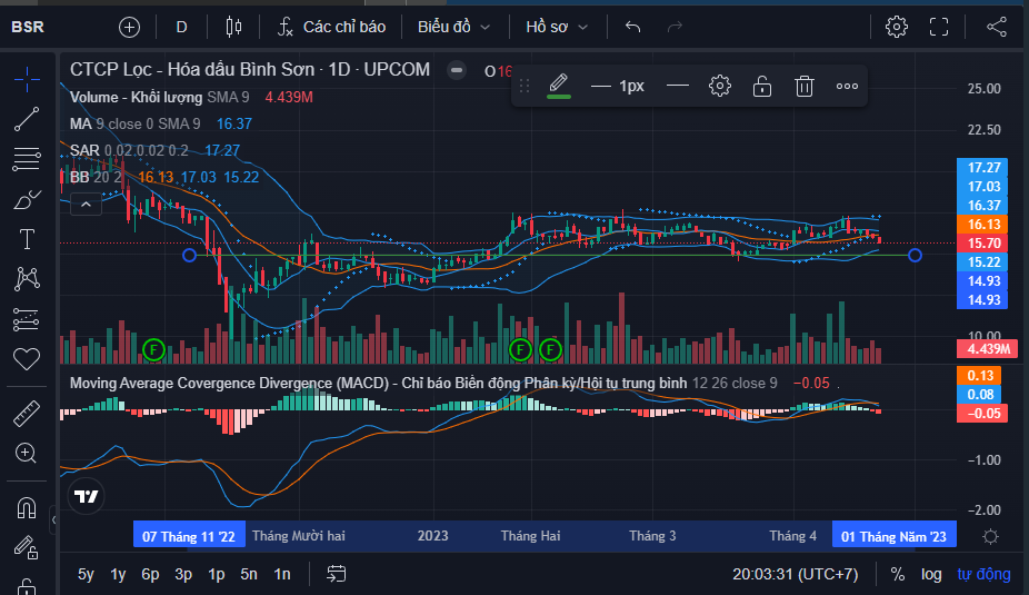 SAR hướng xuống, BB bo cũng chưa hẹp, khả năng break mạnh là ko có, SW thì đúng hơn, điểm đẹp mua là cuối 14 đầu 15 cũng là ok rồi bác, hỗ trợ mạnh ở 15 rồi.