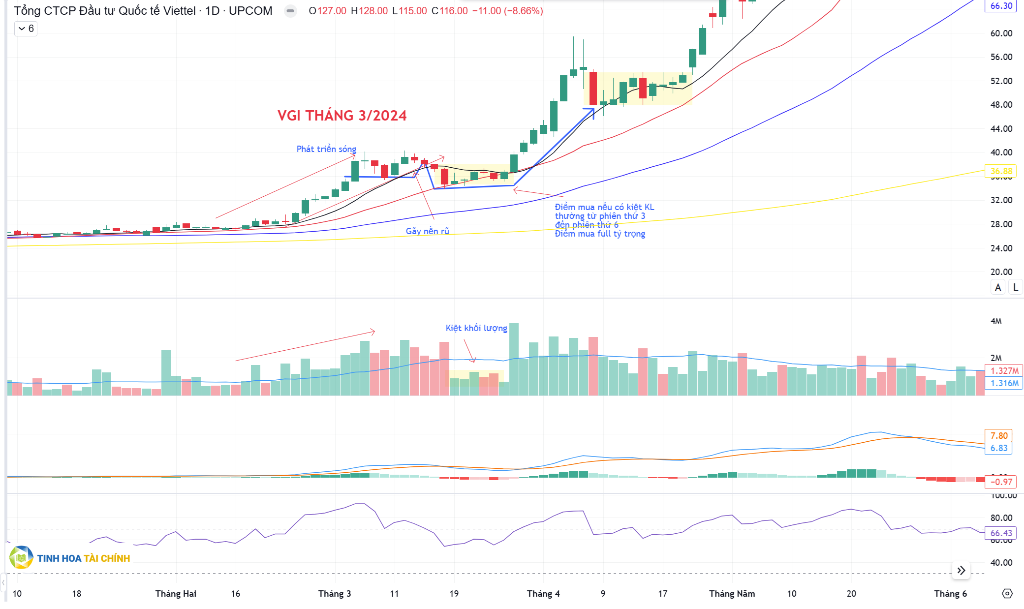 Ví dụ cổ phiếu VGI ở giai đoạn 3/2024 khi cổ phiếu có nhịp phát triển sóng tăng giá hơn 40% từ vùng 27 lên 40 và sau đó thị trường chung rung lắc thì cổ phiếu cũng xuất hiện vùng gãy rũ và đi kèm sau đó là vùng kiệt về khối lượng. Nếu xuất hiện vùng kiệt về khối lượng kể từ phiên thứ 3 trở đi với độ biến động chặt thì đó sẽ là điểm mua full tỷ trọng chứ không cần chờ cây nổ, thường vùng kiệt khối lượng sẽ có 4 đến 7 phiên.