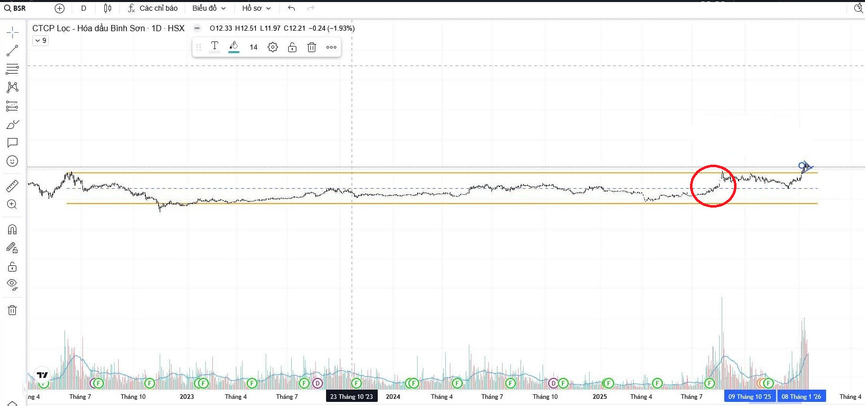 Trên đồ thị phân tích kỹ thuật cổ phiếu BSR thì phiên giao dịch ngày 09/01/2026 đánh dấu 1 phiên khá quan trọng khi cổ phiếu bứt vùng đỉnh 52 tuần vùng 19.4, đây cũng là vùng đỉnh thời đại của BSR trong quá khứ.