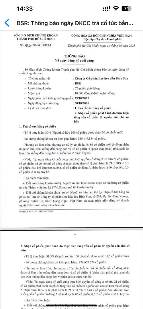 Tốc độ làm việc của ban lãnh đạo mới của BSR từ năm 2024 đến nay phải gọi là cực kỳ khẩn trương, 1/10 có kết quả bỏ phiếu, 8/10 có tin UBCK nhận đủ hồ sơ, hôm nay ra tin ngày giao dịch hưởng quyền luôn là 30/10 cho phát hành vốn, quá tuyệt vời, ngoài đánh giá tình hình tài chính, sự quyết liệt và dứt khoát của ban lãnh đạo cũng là một yếu tố quan trọng, vậy chờ lọt rổ VN30 và PVN thoái bớt vốn là ổn :3