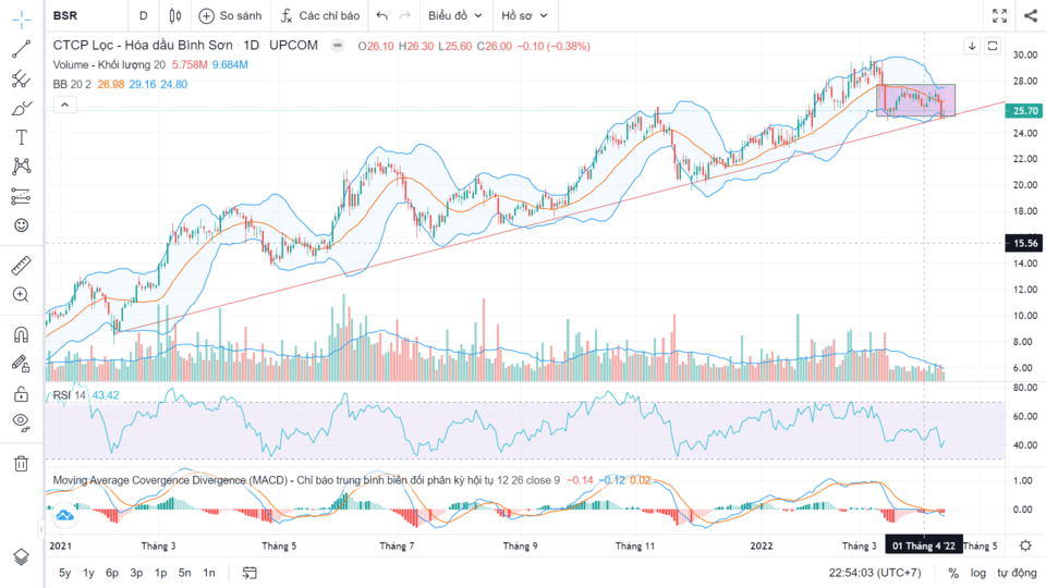 Sau giai đoạn tích lũy gần một năm trong 2020, BSR xuất hiện giai đoạn chuyển tiếp, bắt đầu xu hướng tăng từ đầu năm 2021 và duy trì vận động giá trên đường Trendline này. BSR đang quay lại test đường Trendline và tích lũy đi ngang quanh đây với thanh khoản cạn dần thích hợp để phân bổ mua dần.