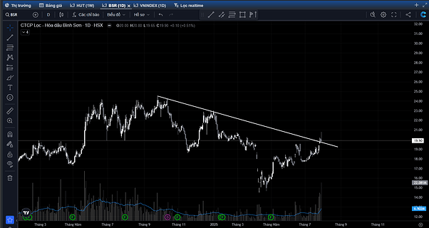 - Hiện tại giá cổ phiếu BSR đã vượt cản chéo trung hạn với khối lượng vào đột biến. Nhà đầu tư có thể mua vào cổ phiếu khi giá về dưới 20.