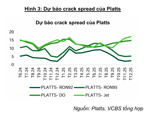 - Trong năm 2025, biên lợi nhuận lọc dầu toàn cầu được dự báo tiếp tục chịu sức ép do (1) Tăng trưởng nhu cầu nhiên liệu chậm lại dưới tác động của chính sách thuế quan từ chính quyền Mỹ; và (2) Giá dầu thô duy trì xu hướng giảm.