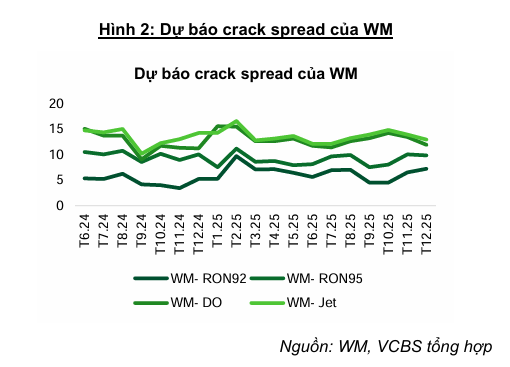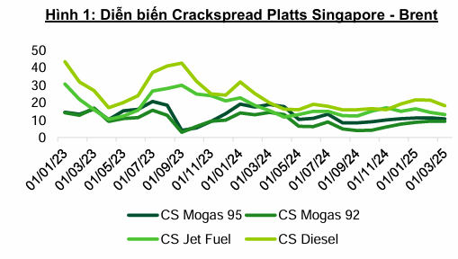- Mặc dù giá dầu thô được dự báo tiếp tục suy giảm trong quý 2/2025, qua đó tạo áp lực giảm giá đối với xăng dầu, nhưng tác động này phần nào được bù đắp bởi hoạt động bảo dưỡng tại các nhà máy lọc dầu và mức tồn kho xăng ở mức thấp. Điều này góp phần hỗ trợ đà phục hồi của crack spread sản phẩm xăng dầu.