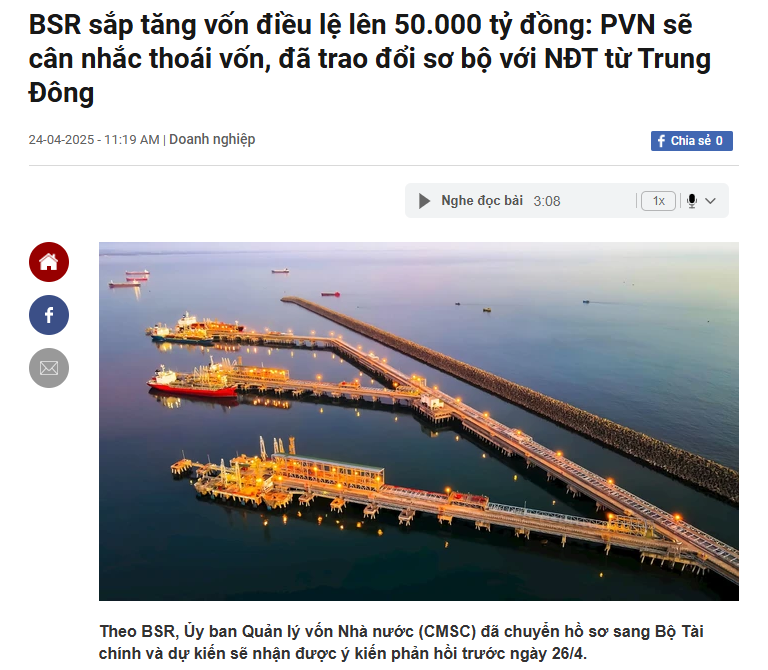 - BSR đã trình phương án tăng vốn lên Tập đoàn Dầu khí Việt Nam (PVN), và PVN đã gửi văn bản số 12/2024 trình Ủy ban Quản lý Vốn Nhà nước tại Doanh nghiệp (UBQLV) vào tháng 12/2024. Sau khi Ban chỉ đạo chuyển tiếp tiếp nhận bàn giao từ UBQLV vào ngày 15/4/2025, đề án đã được rà soát, giải trình chi tiết và hoàn tất trước ngày 26/4/2025. Ban chỉ đạo dự kiến sẽ trình phê duyệt trong thời gian tới.