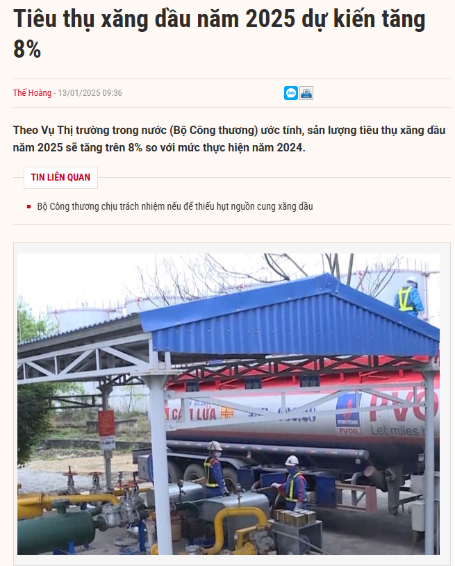 - Triển vọng ngành xăng dầu năm 2025 được đánh giá tích cực nhờ nhu cầu tiêu thụ trong nước tiếp tục tăng mạnh. Theo Bộ Công Thương, sản lượng tiêu thụ xăng dầu dự kiến tăng trên 8% so với năm 2024, trong bối cảnh kinh tế Việt Nam duy trì tốc độ tăng trưởng GDP 6,5–7,0% và hướng tới mục tiêu 7,0–7,5% theo Nghị quyết 158/2024/QH15 của Quốc hội.