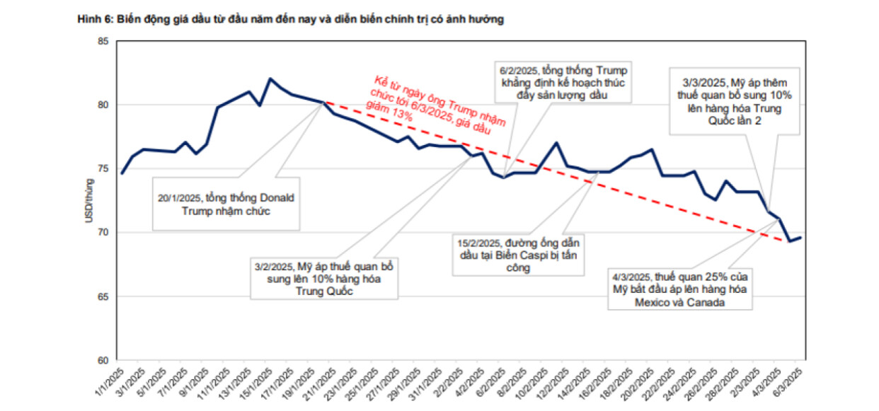 Trong nửa đầu năm 2025, giá dầu Brent có biến động mạnh do ảnh hưởng từ các yếu tố chính trị và chiến tranh thương mại. Từ mức 82 USD/thùng đầu năm, giá dầu giảm xuống dưới 70 USD/thùng vào tháng 3/2025 khi Mỹ áp thuế cao đối với hàng hóa từ Mexico, Canada và Trung Quốc. Điều này tác động đến cung – cầu dầu thô, làm suy yếu nhu cầu tiêu thụ và kéo theo sự sụt giảm giá sản phẩm lọc hóa dầu.