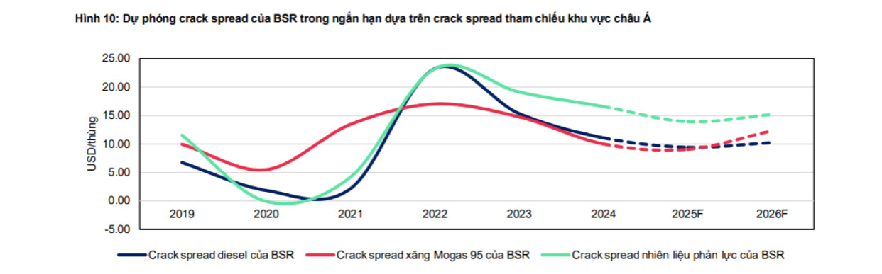 Ngắn hạn, BSR gặp áp lực từ xu hướng giảm của crack spread và giá dầu, ảnh hưởng đến biên lợi nhuận lọc dầu.