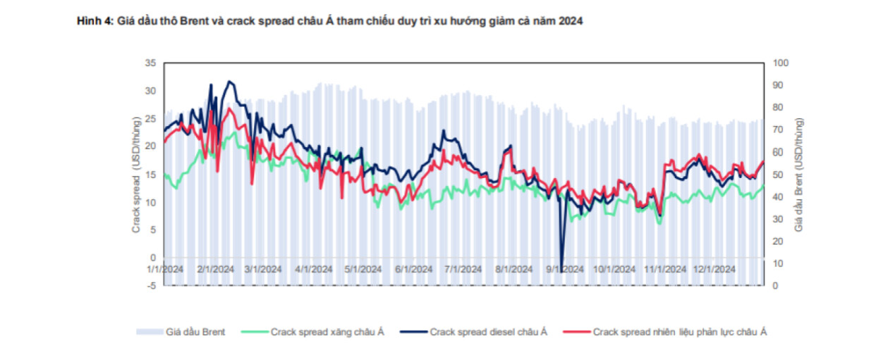 Trong quý 4/2024, sản lượng tiêu thụ của Công ty Cổ phần Lọc hóa dầu Bình Sơn (BSR) giảm 8% so với cùng kỳ năm trước (svck) và 6% so với quý trước. Đồng thời, crack spread bình quân của diesel và nhiên liệu phản lực tại khu vực châu Á giảm mạnh 47% svck và 39% sv quý trước, ảnh hưởng tiêu cực đến doanh thu và lợi nhuận gộp của doanh nghiệp. Mặc dù sản lượng tiêu thụ có dấu hiệu phục hồi, nhưng sự sụt giảm của crack spread đã tác động đáng kể đến hiệu quả kinh doanh trong quý.