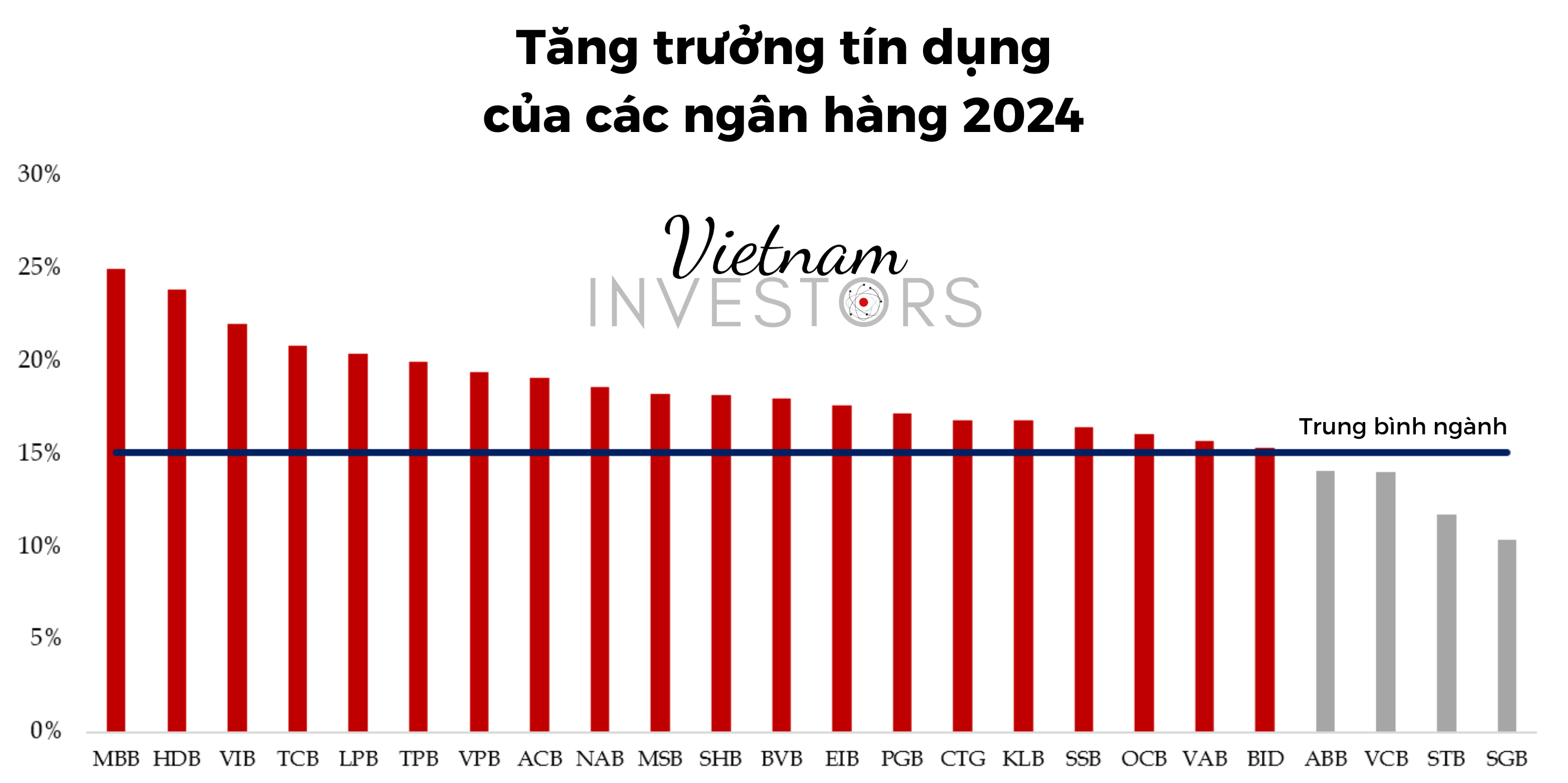 Quán quân về tăng trưởng tín dụng là MBB (25%), các ngân hàng lợi nhuận tỷ đô khác như TCB, CTG cũng ghi nhận mức tăng trưởng vượt trội so với KPI 15% của SBV.