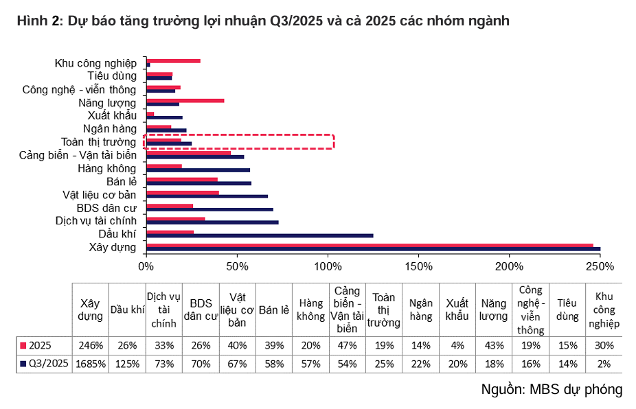Theo báo cáo mới nhất của MBS Research, lợi nhuận toàn thị trường trong quý 3/2025 được dự báo tăng trưởng 25% so với cùng kỳ năm trước, nhờ môi trường lãi suất thấp, đầu tư công giải ngân mạnh mẽ và hàng loạt chính sách hỗ trợ doanh nghiệp. Đáng chú ý, mức tăng trưởng không chỉ tập trung ở một vài lĩnh vực mà có sự lan tỏa rộng rãi.