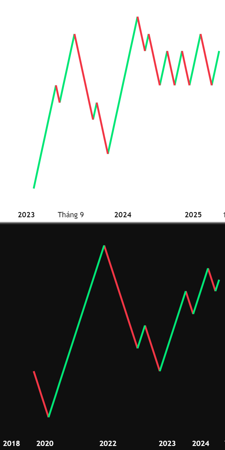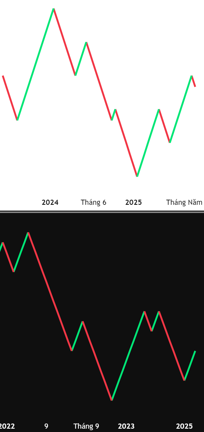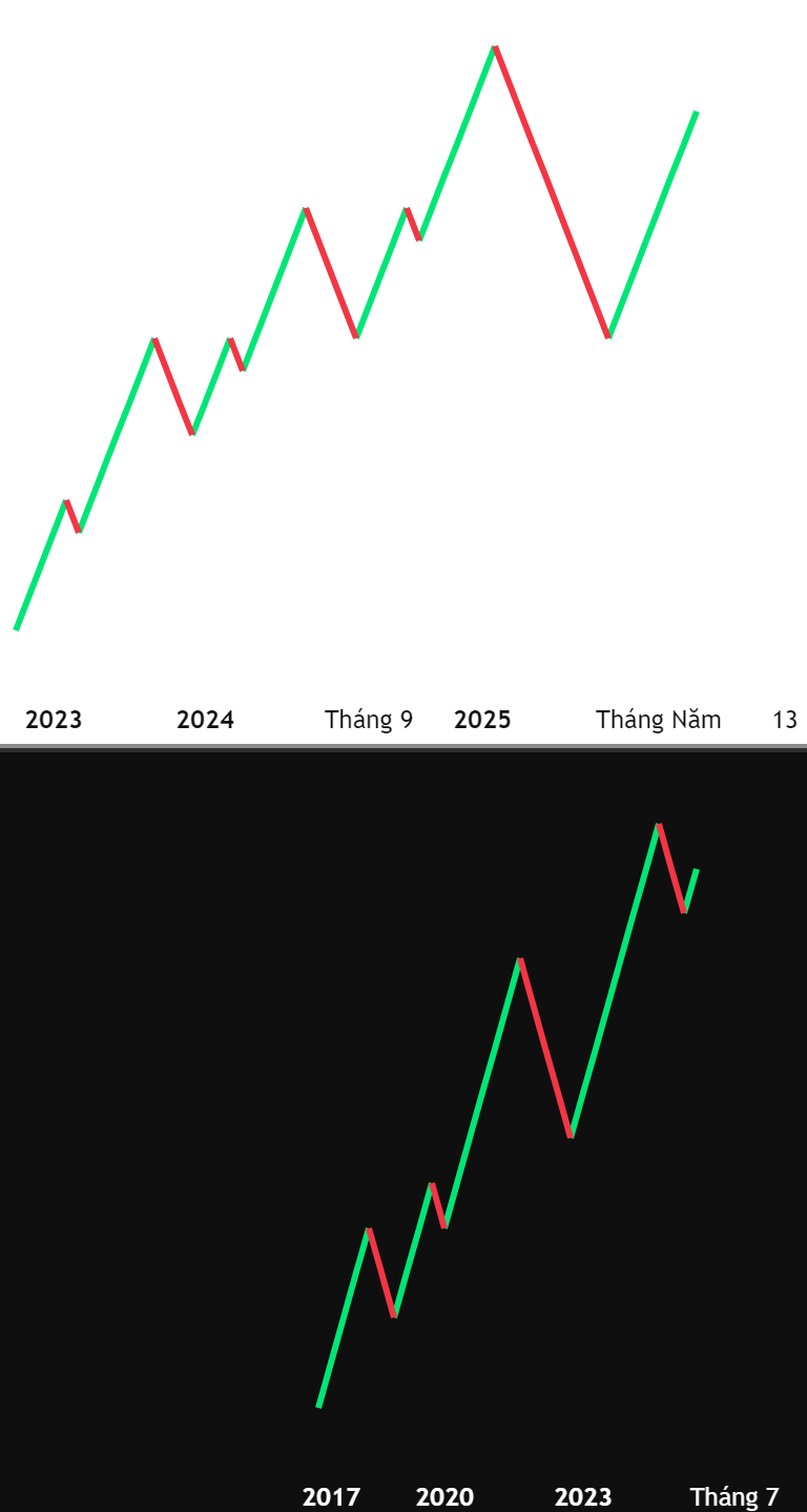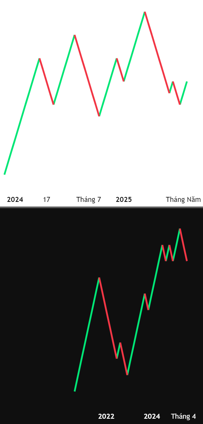 - Nhược điểm: sẽ có độ trễ nhất định (ví dụ: sóng tăng 2020-2021 bắt đầu tháng 4 nhưng phải tới tháng 5 hệ thống mới xác nhận; hay tạo đáy giữa 2022 mà đến đầu 2023 mới xác nhận chính thức).