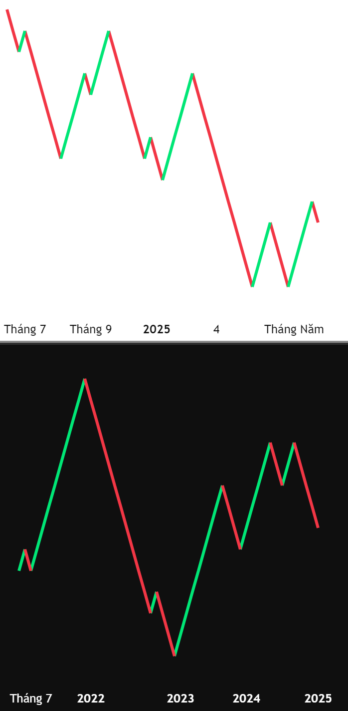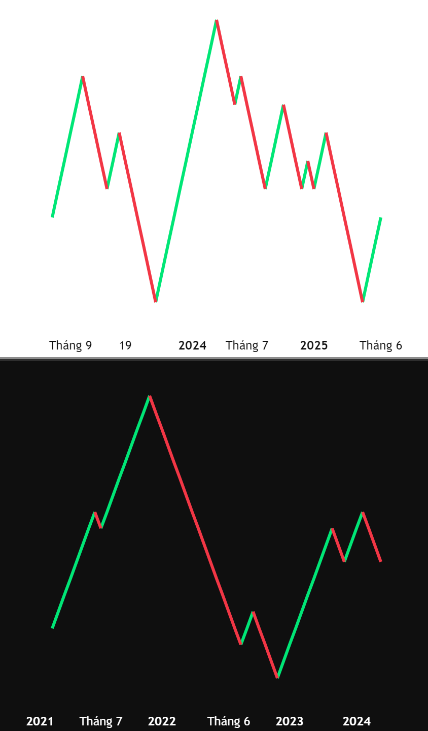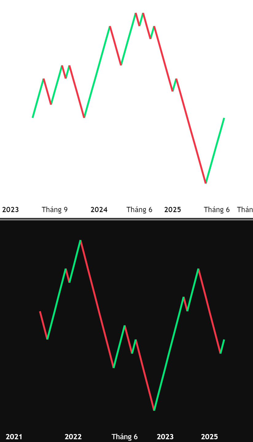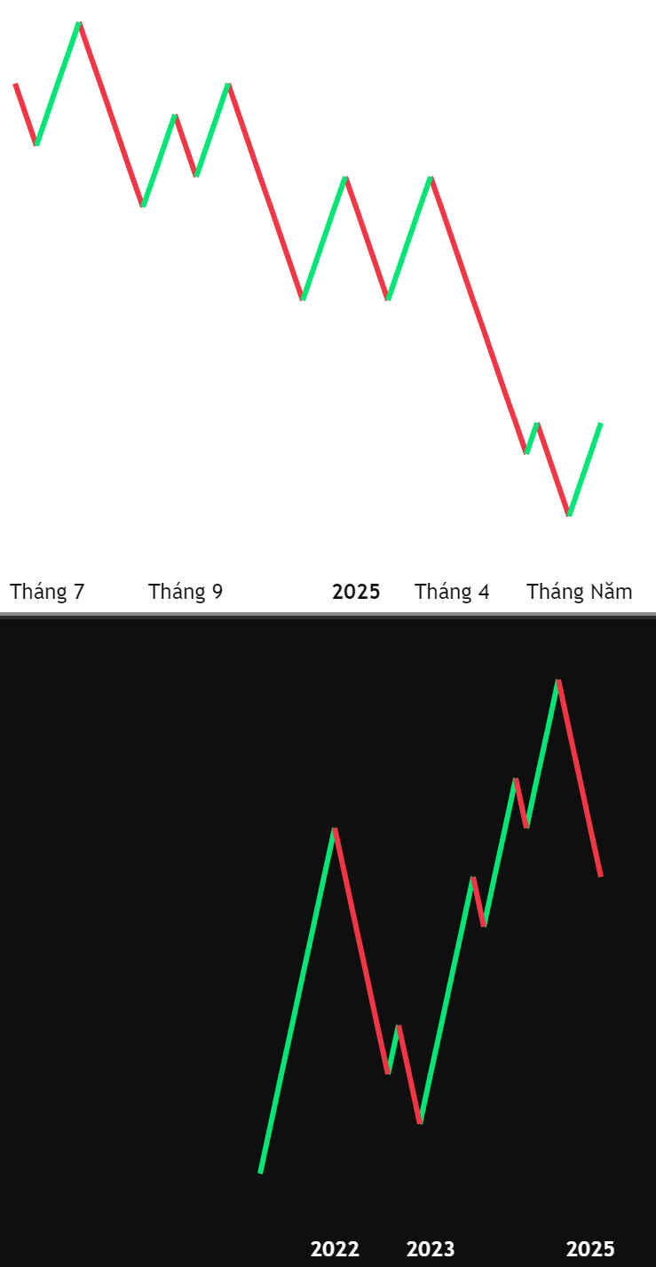 - Nhược điểm: sẽ có độ trễ nhất định (ví dụ: sóng tăng 2020-2021 bắt đầu tháng 4 nhưng phải tới tháng 5 hệ thống mới xác nhận; hay tạo đáy giữa 2022 mà đến đầu 2023 mới xác nhận chính thức).