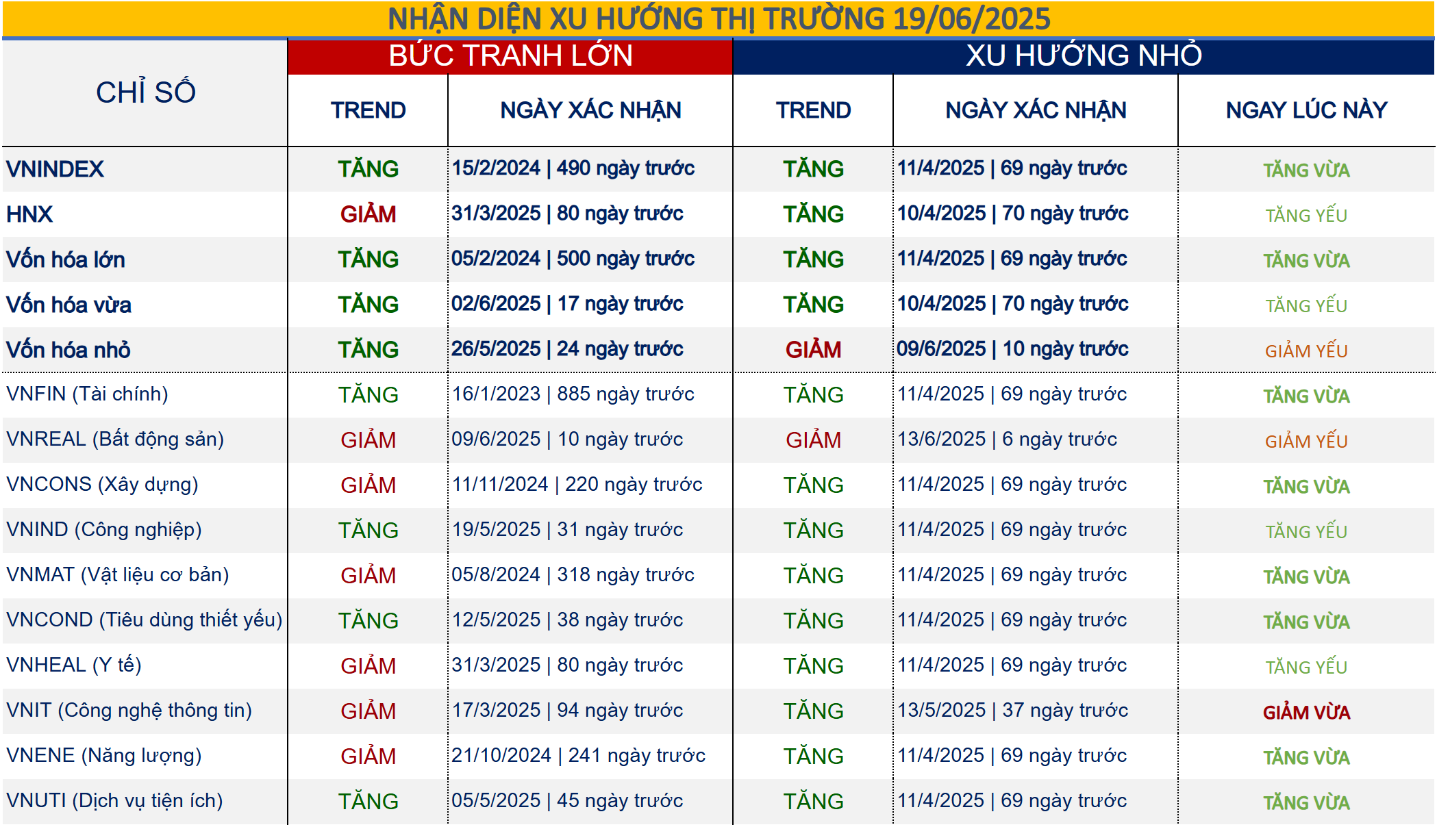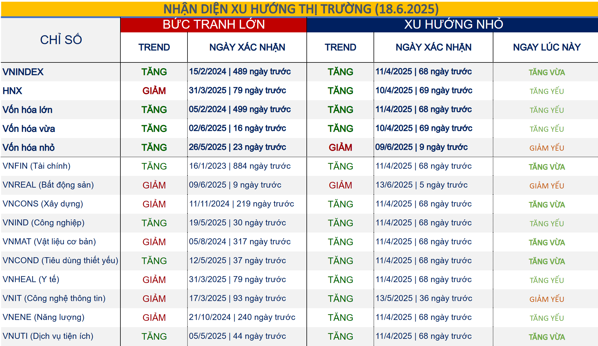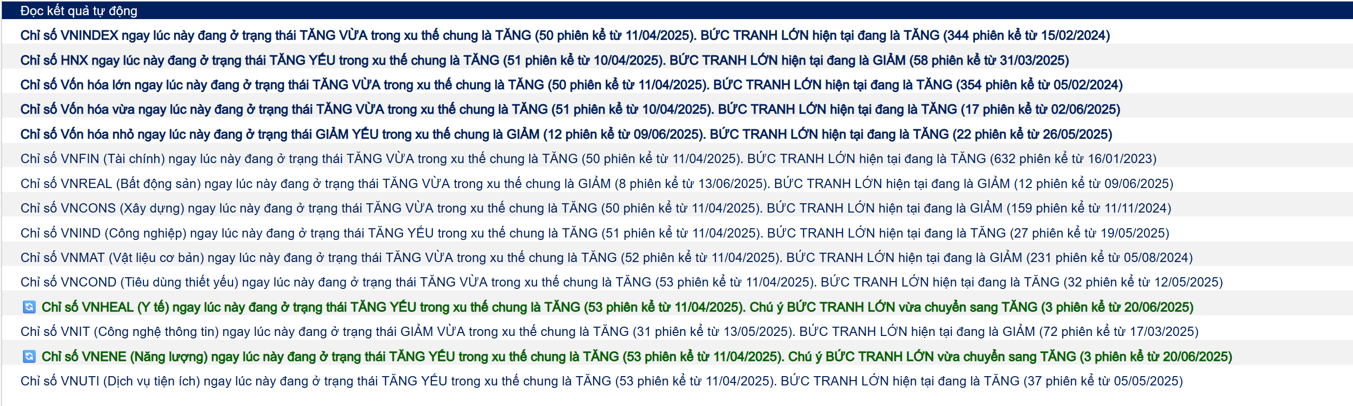 - Dòng trạng thái rõ ràng: Mỗi ngành/chỉ số đều có trend lớn và trend nhỏ, trạng thái động lực kèm ngày xác nhận (cả bằng số ngày và “hôm nay/hôm qua…” để ai cũng dễ đọc).