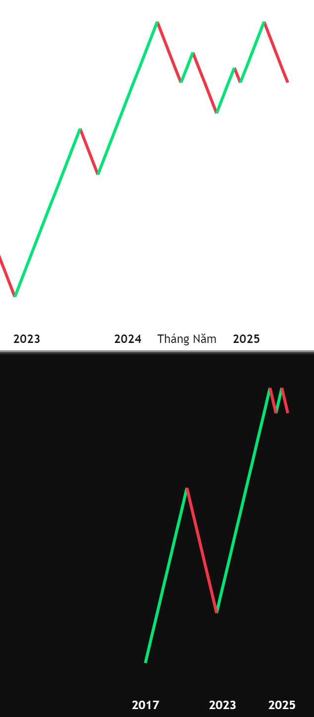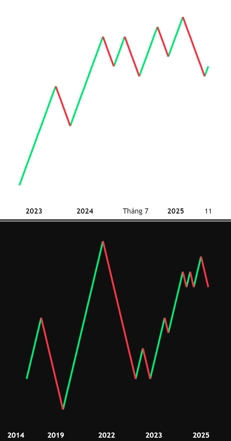 Nhìn lại, trong mỗi con sóng lớn đó, có không ít lần điều chỉnh sâu hoặc hồi kỹ thuật mạnh, nhưng thực ra, nếu được “quay lại quá khứ”, ai cũng chỉ ước: