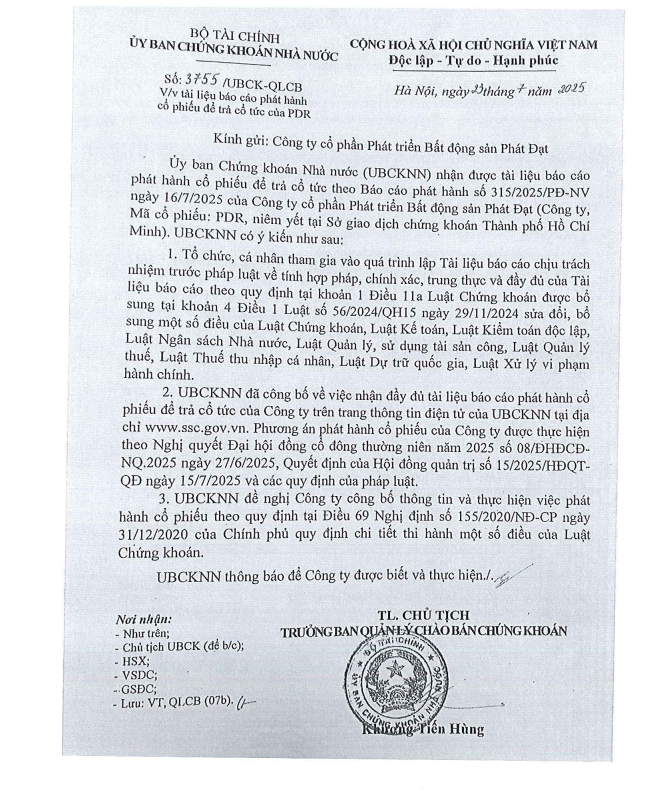Ngày 24/07/2025, Công ty Cổ phần Phát triển Bất động sản Phát Đạt (PDR) chính thức thông báo đã nhận được Công văn số 3755/UBCK-QLCB của Ủy ban Chứng khoán Nhà nước, xác nhận đã tiếp nhận hồ sơ phát hành cổ phiếu để trả cổ tức theo phương án được Đại hội đồng cổ đông thường niên năm 2025 thông qua.