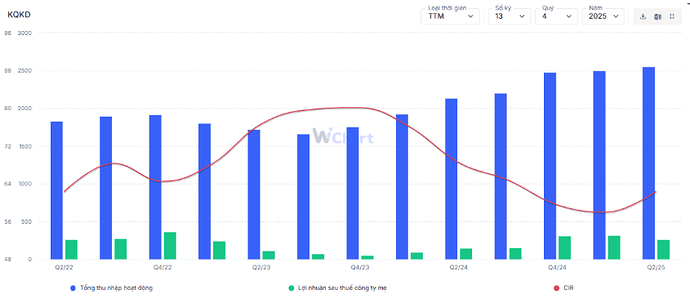 Xét về tổng thể, BVB có lẽ vẫn đang trong quá trình tái cấu trúc để tìm ra công thức tăng trưởng của riêng mình. Tính đến hết 30/06/2025, tổng tài sản của ngân hàng đạt 115,5 nghìn tỷ, tăng 12% so với đầu năm và đạt 95% kế hoạch năm. Tổng thu nhập từ hoạt động kinh doanh (TOI) đạt 684 tỷ đồng (+8,6% yoy) nhưng LNST của ngân hàng này chỉ đạt 10,3 tỷ đồng - giảm mạnh 84% yoy. Nguyên nhân của sự “lệch pha” này chủ yếu đến từ việc ngân hàng này mở rộng chi nhánh, cũng như nâng cấp hệ thống CNTT. Chi phí hoạt động trong quý đạt mốc 488 tỷ đồng - tăng mạnh 42% yoy. (Hình 1)
