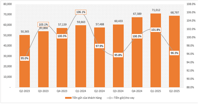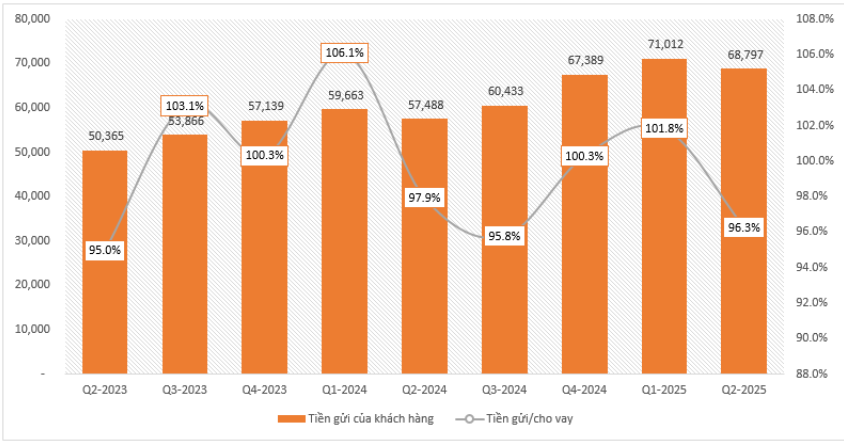 Về đầu vào, sau 4 quý liên tiếp tăng trưởng về con số tiền gửi, thì Q2/25 là quý đầu tiên chỉ tiêu này giảm nhẹ. Tỷ lệ tiền gửi/cho vay cũng giảm về mức 96,3%. Nếu tỷ lệ này tiếp tục giảm thì có thể sẽ gây áp lực lên tín dụng trong những quý tới nên chỉ số này cần được theo dõi sát sao để đánh giá. Tuy nhiên chúng tôi kỳ vọng nửa cuối năm khi nền kinh tế tốt hơn, dòng vốn được tiếp cận tới đúng đối tượng thì tỷ lệ này sẽ duy trì được quanh mốc 100%. (Hình 5)
