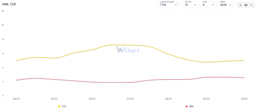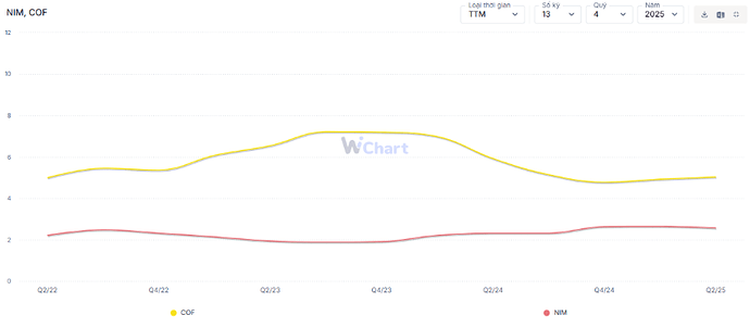 - Mảng kinh doanh lãi: Ngành ngân hàng nói chung, BVB nói riêng trong thời gian vừa qua phải giảm lãi suất cho vay theo định hướng từ Chính phủ. Vì thế COF trong quý có dấu hiệu tăng nhẹ lên mốc 5,03% - nhưng vẫn thấp hơn giai đoạn 2023 - 2024 (khoảng 7%). NIM trong quý đạt 2,57% - thấp hơn mức trung bình ngành khi BVB không có thế mạnh về CASA như những ngân hàng cùng phân khúc. (Hình 2)