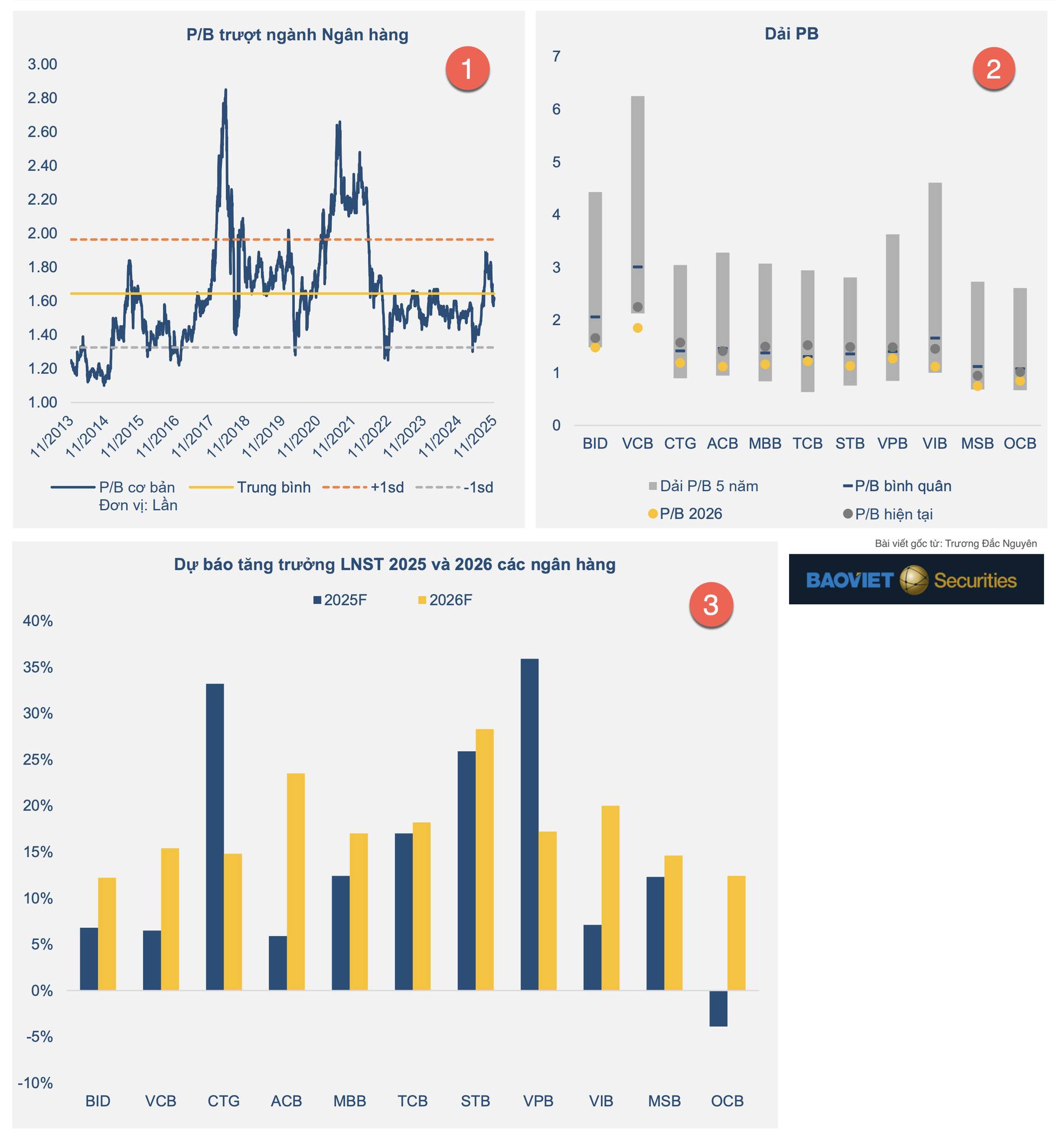 P/B 2026 của hầu hết ngân hàng (đặc biệt BID, VCB, CTG, MBB, ACB) đều thấp hơn trung bình 5 năm thể hiện định giá đang ở vùng thấp khi so sánh với đỉnh của chu kỳ tăng giá trước.