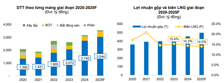 Với các nhận định kể trên, dự báo mảng Xây lắp năm 2025 ghi nhận DTT ở mức 3.044 tỷ đồng (+11,1% yoy) và LNG đạt 259 tỷ đồng (+6,3% yoy). Biên LNG giảm nhẹ về mức 8,5%.