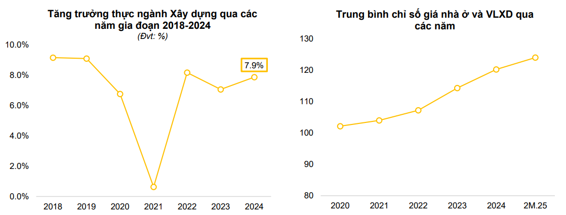 - Theo BMI Research (thuộc Fitch Group), dự báo tăng trưởng thực ngành Xây dựng - Công nghiệp năm 2025 đạt khoảng 8,2%, cao hơn so với 2024. Qua đó, thể hiện rõ kỳ vọng Xây dựng sẽ tiếp