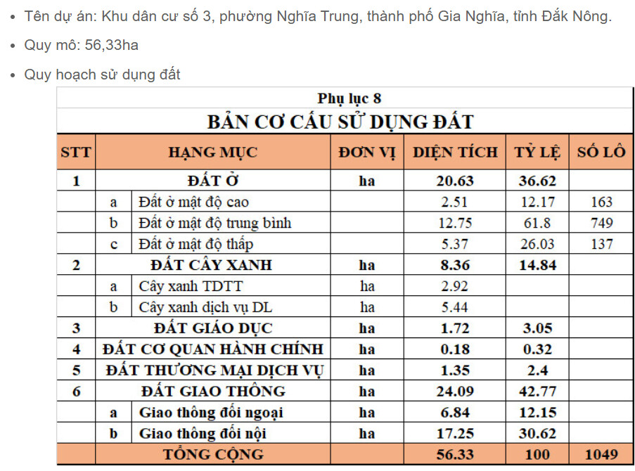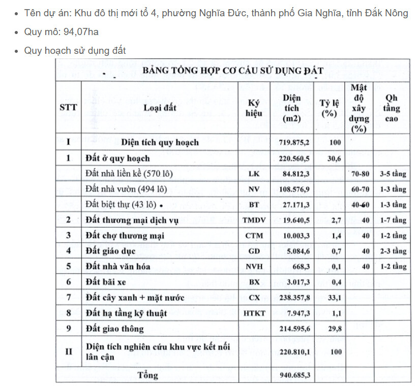 Chi tiết quy hoạch dự án Khu đô thị mới tổ 4, phường Nghĩa Đức, Thành phố Gia Nghĩa, tỉnh Đắk Nông