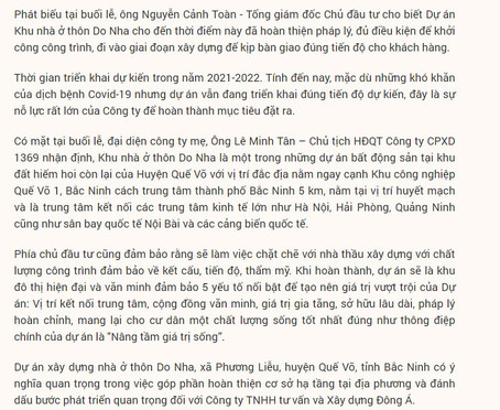 Dự án Thông Cả - Đồng Côi - Bắc Ninh hoàn thành trong 2021 đang bàn giao nhà và kết doanh thu dự án này