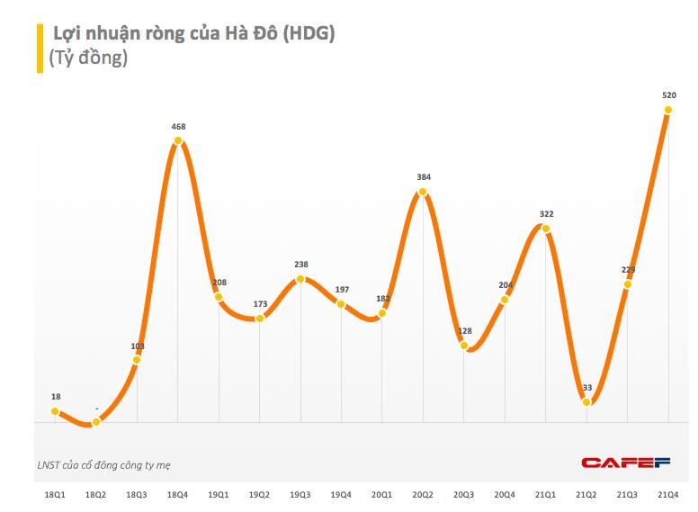 Luỹ kế cả năm 2021, Hà Đô đạt gần 3.842 tỷ đồng doanh thu thuần, giảm 23% và LNST đạt hơn 1.333 tỷ đồng, tăng 6% so với năm 2020. LNST công ty mẹ là 1.090 tỷ đồng tăng 11,3% so với năm 2020 - Đây cũng là lần đầu tiên HDG có lợi nhuận vượt mốc 1.000 tỷ đồng.